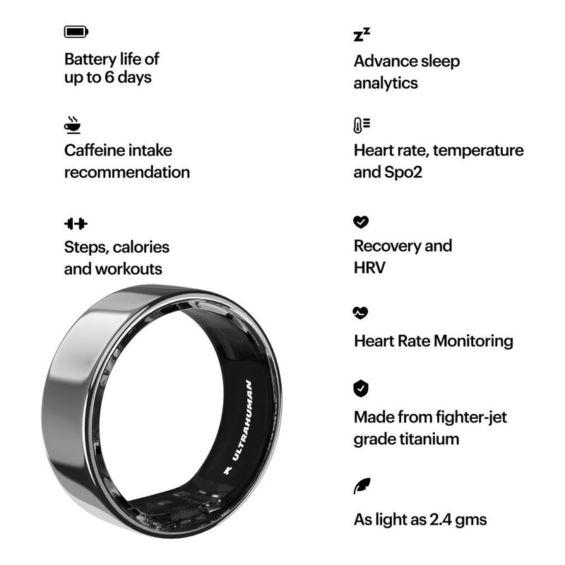 | Connectivity: | Bluetooth Low Energy (BLE5) Automatic firmware updates via the Ultrahuman App Compatible with iPhones running iOS 14 or later and Android devices running Android 6 or later. EMF radiation safe |