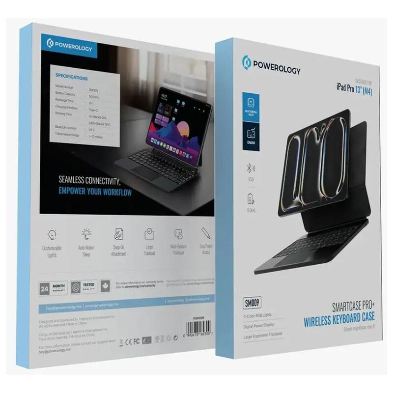 The Powerology Smartcase Pro+ Wireless Keyboard Case is designed to elevate your iPad Pro 13" (M4) experience to the next level with seamless functionality and looks. Driven by a 500mAh battery, it offers up to 3 hours of backlit operation and an astonishing 240 hours without backlight, with quick recharge in 2 hours via the Type-C port. It comes with Bluetooth V5.0 for a stable connection with over 10 meters of transmission distance for uninterrupted productivity. The keyboard has customizable backlights for optimal typing comfort in any environment and includes multimedia keys for convenient control. It has a snap-on design for easy installation and removal and a roomy trackpad with multi-gesture controls for enhanced navigation. It is practically designed and offers easy Apple Pencil access and smart auto wake/sleep to conserve battery life. The case combines protection and performance for an elevated iPad Pro experience.