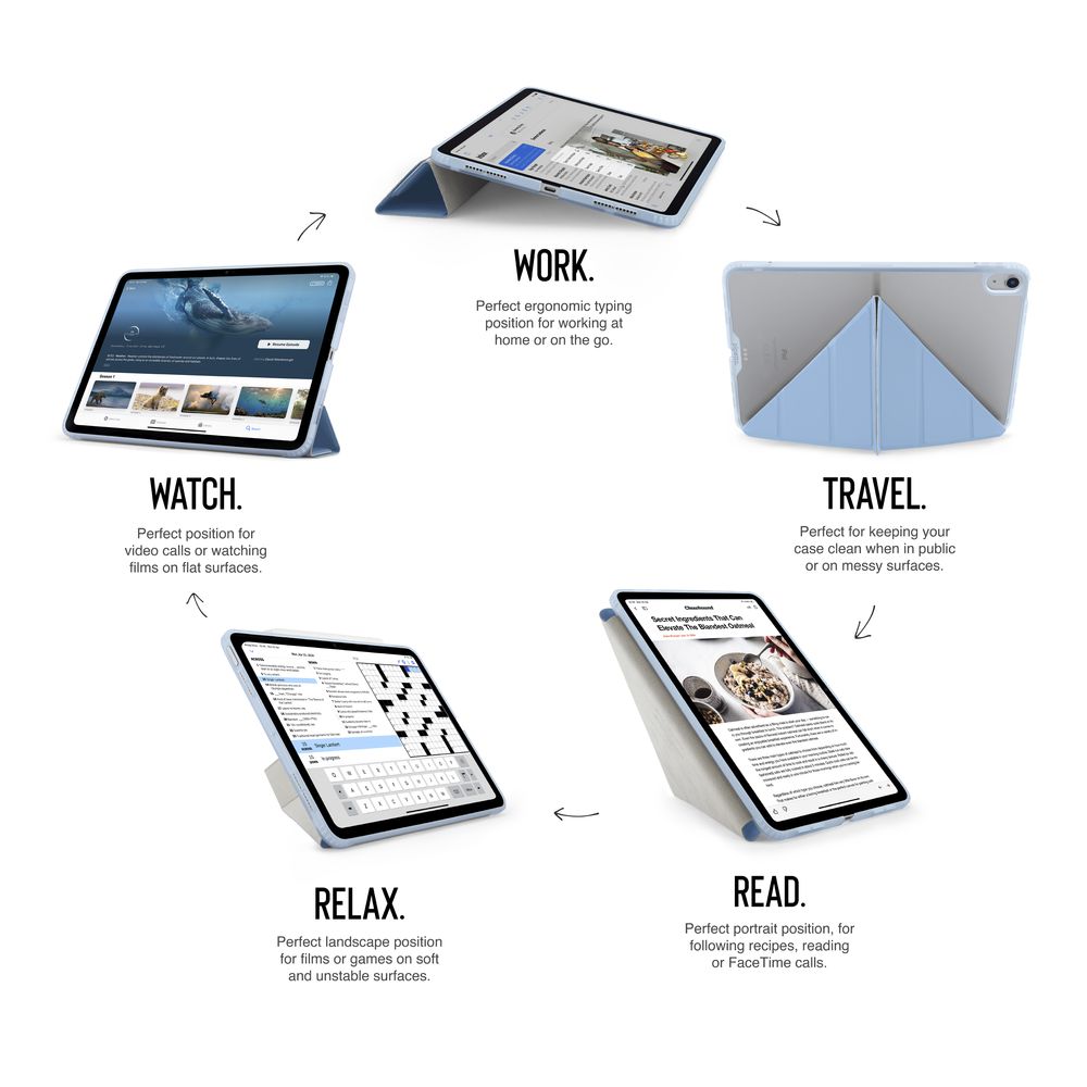 Versatile 5-in-1 folding design with its shock absorbent TPU shell, internal air pockets and magnetic front cover.
