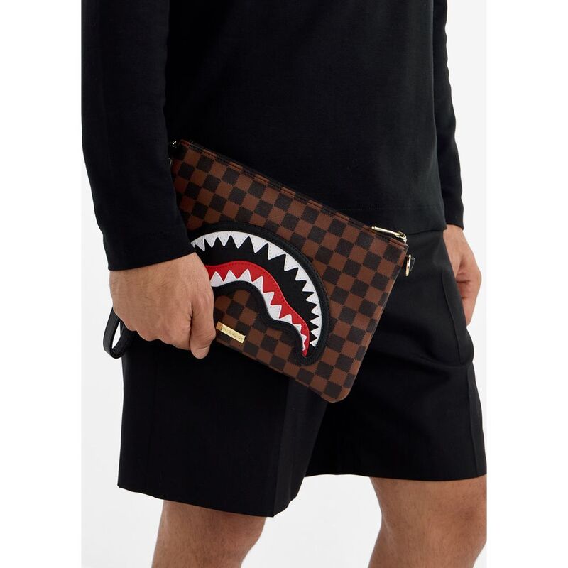 The Sawtooth Sharks in Paris crossbody clutch by Spray ground is built for the man who's on-the-go, with just the right edge. Compact yet roomy enough for your essentials, it features a zippered top closure, a detachable wristlet strap, an adjustable shoulder strap, and a back band for easy carry.