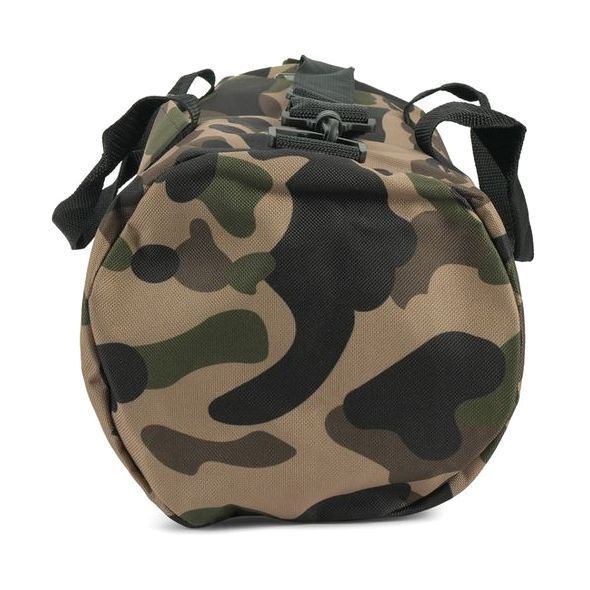 This BAPE Dark Green Camo Mini Duffle Bag is crafted from durable materials, featuring a timeless camouflage print in shades of green, with the iconic BAPE logo on a small tag near the top. It offers a blend of style and practicality, offering a spacious main compartment, easily accessible through a wide zippered opening. Black canvas straps offer comfortable carrying options, with both short top handles and an adjustable, detachable shoulder strap for added convenience.