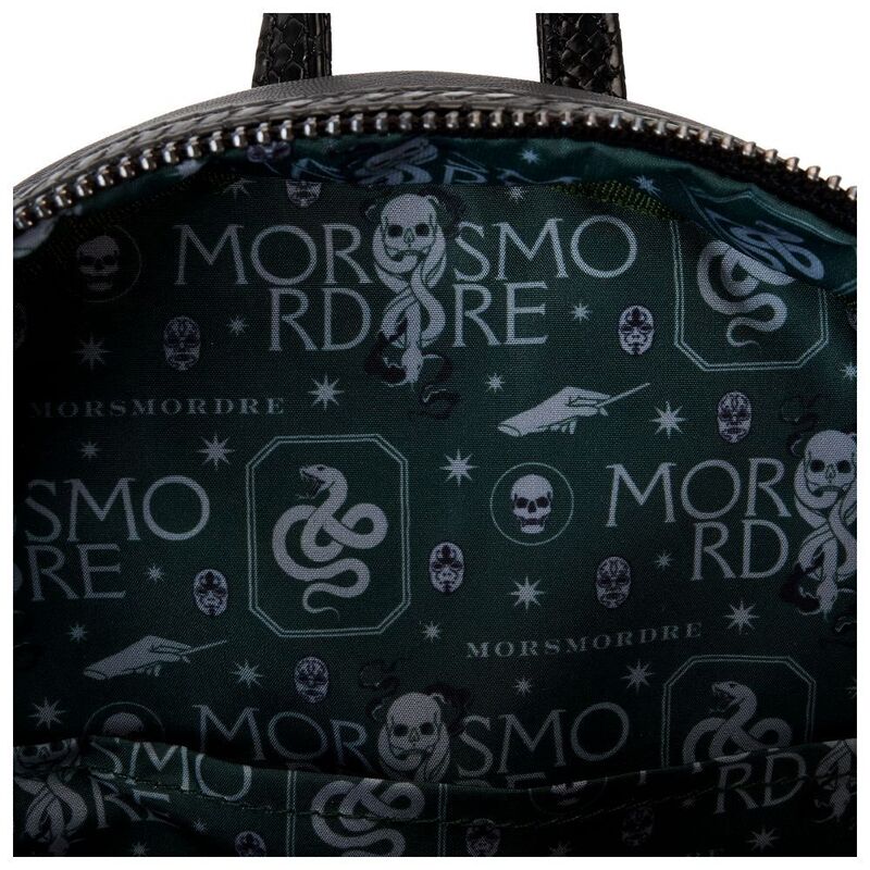 Heading to Malfoy Manor for an important meeting? Do so in style with our Harry Potter™ Death Eater Mini Backpack. This wickedly fashionable accessory features an oval-shaped front pocket with a Death Eater’s face that comes to life in applique, silver metallic vegan leather, and embroidered detail. Elegant flourishes appear on the main part of the backpack, just behind the front pocket, and they continue on the side panels. On one side panel, you will find the image of a serpent, and on the other, a skull. Turn the backpack around, and the incantation for conjuring up the Dark Mark appears: “Morsmordre.” Pack your potions, wand—or daily essentials—and take off on magical adventures in character.