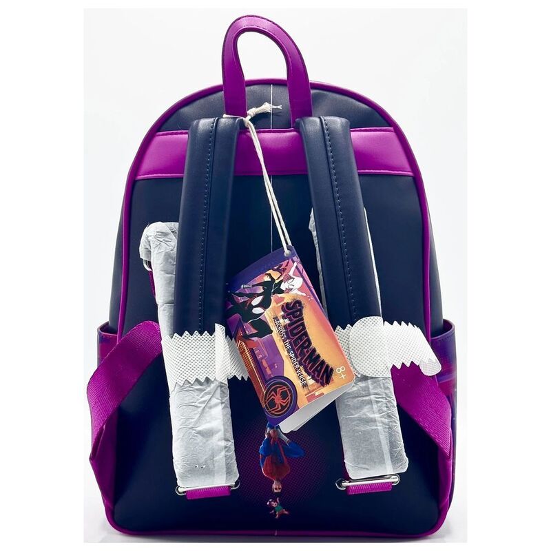 Join Miles Morales on an epic adventure with this Loungefly Across The Spider Verse Mini Backpack! Inspired by the iconic Marvel Spiderman masterpiece, this bag features a purple exterior with portraits of characters Pavitr Prabhaker, Gwen Stacey, Jessica Drew, Hobie Brown, Spider Cat, Miguel O'Hara, Ben Reilly and also Margo Kess. The piece is then finally complete with the classic double ip fastenings and signature enamel logo.