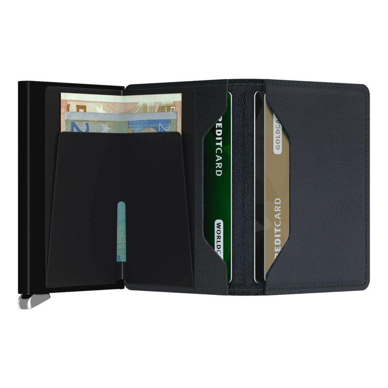 The Slimwallet resembles the Miniwallet, but has no press stud closure and is even slimmer. The Slimwallet fits easily into the breast pocket of a jacket. Its slim profile allows the Slimwallet to fit perfectly into any pocket. The open exterior is designed extra wide to accommodate cards, banknotes and receipts. The Cardprotector mechanism enables you to slide out cards with a simple motion, while the aluminium construction protects your cards from bending, breaking and unwanted wireless communication.