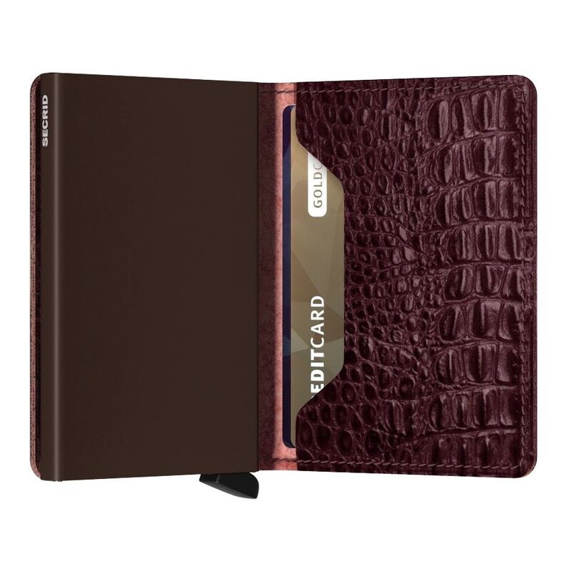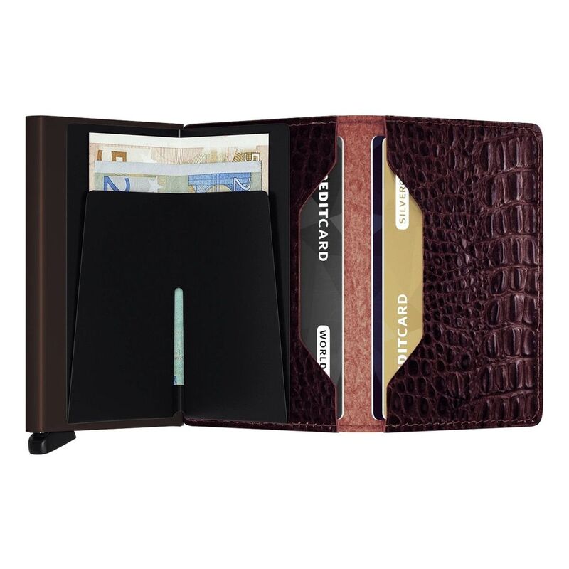 Slimwallet leather is cut wider than the leather of the Miniwallet, providing space for extra cards, bills, business cards, and receipts. The Slimwallet is less suitable for coins.