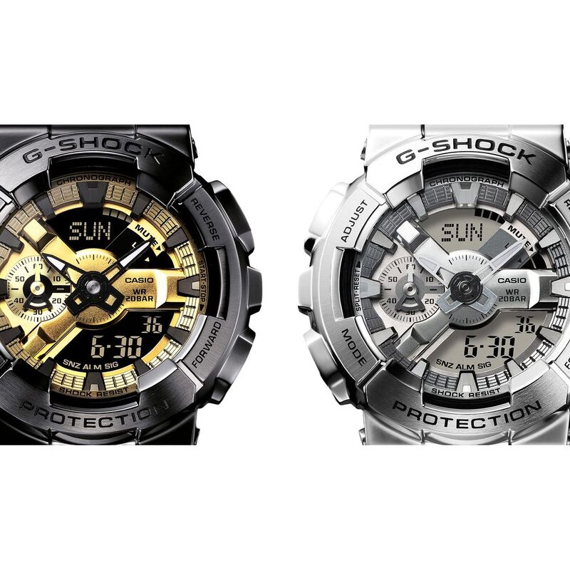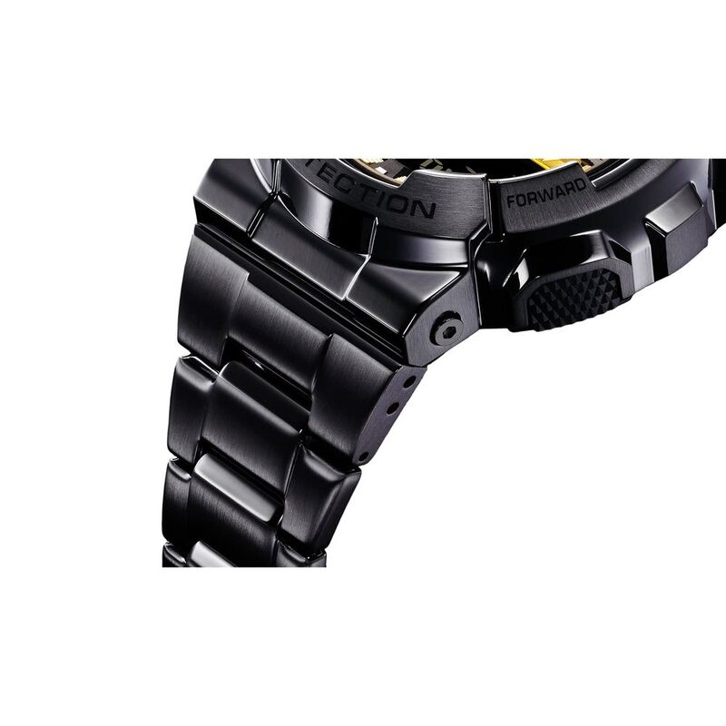 Introducing the GM-110BD, an updated take on the ever-popular large case analog-digital G-SHOCK with metal bezel and band. Precision forging, cutting, and polishing, and even special molding techniques, all go into crafting a metal bezel featuring a rugged, high-impact design, for a solid construction that sacrifices nothing in toughness. The case is made of fine resin to protect the module. With a metal band, all-black ion plating, and dial in a gold color, the GM-110BD-1A9 is up for anything work or play.