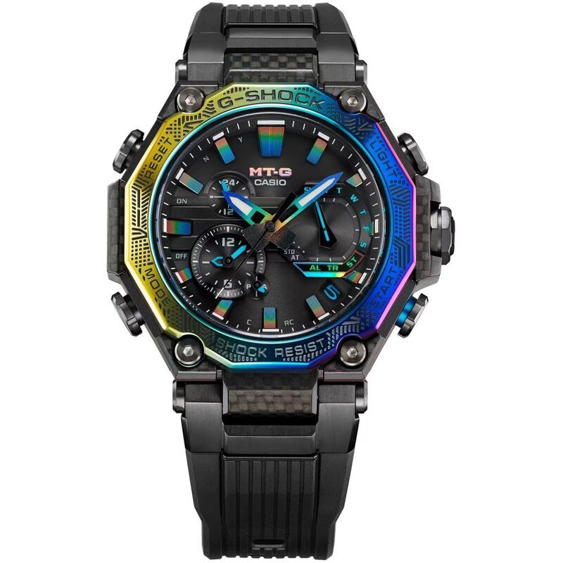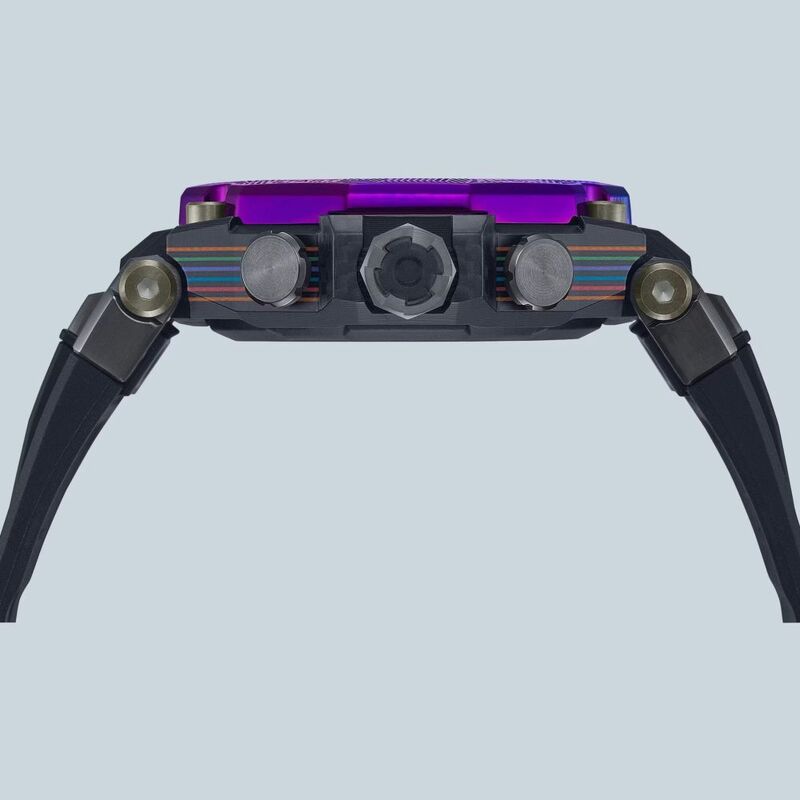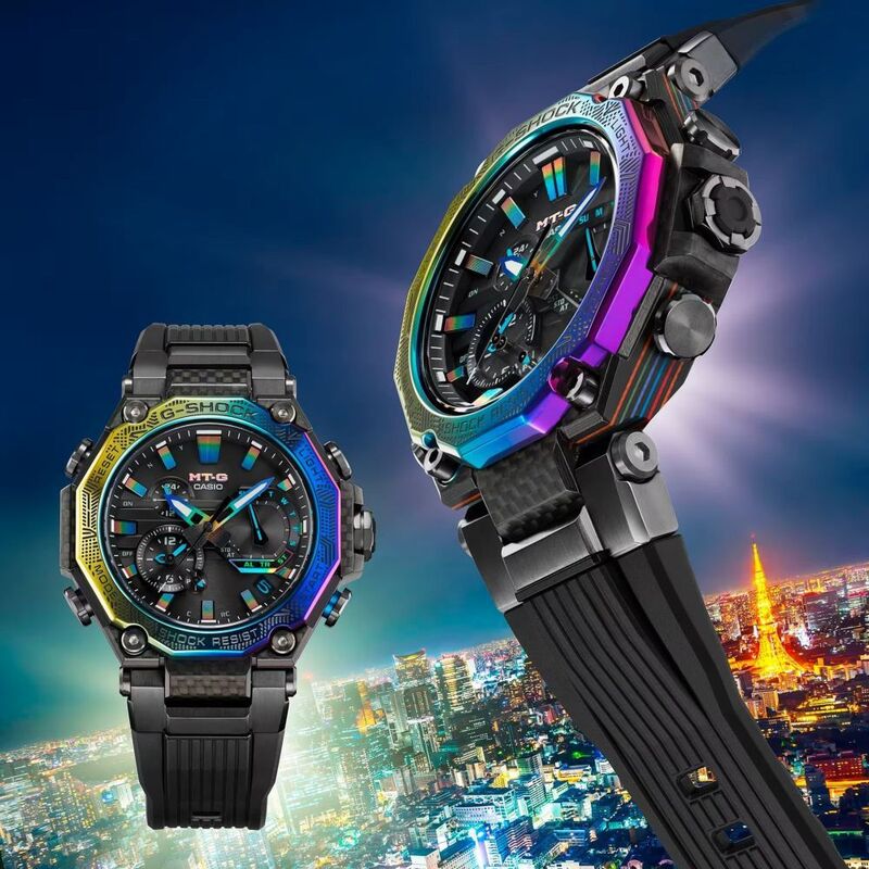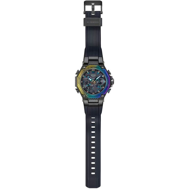 The bezel, in rainbow ion-plated stainless steel, is etched in patterns evoking an urban landscape. The colourful date display and rainbow-coloured index marks, dial hands, and MT-G logo add the final celebration of sophisticated colour.