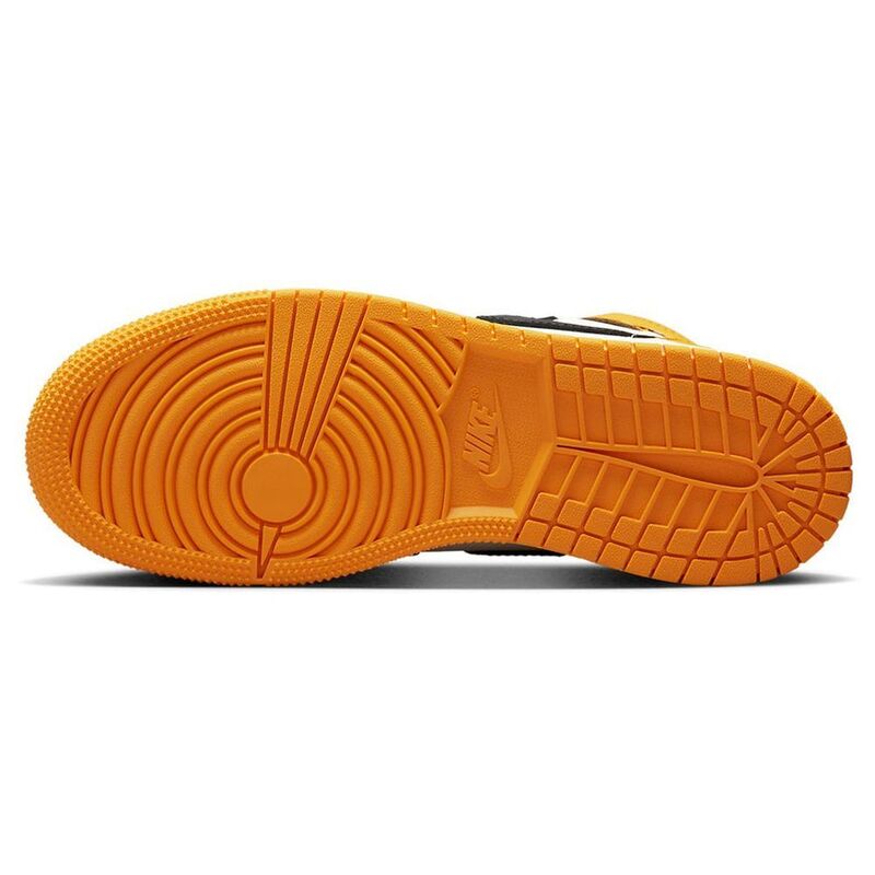 Featuring a standout color block from the 2018 ‘Bred Toe,’ these sneakers combine white leather panels with a Taxi yellow toe box and black accents. Nike Air branding and Wings logo adorn the design, while the rubber cupsole boasts a lightweight Air-sole heel unit.
