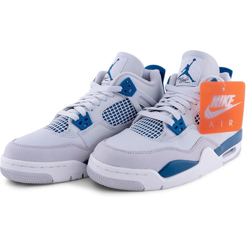 The Jordan 4 Retro Military Blue revives a cherished OG colorway of this iconic silhouette. Smooth off-white leather forms the upper with quarter panel netting and a tonal nubuck forefoot overlay. A striking blue Jumpman logo completes the unique design, matching the molded eyelets and a back tab adorned with Nike Air branding.