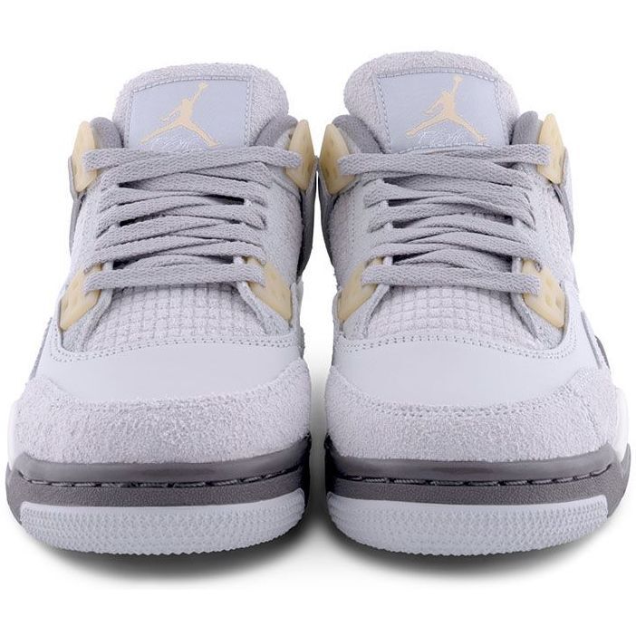 his design features a refined pale grey leather upper with shaggy suede overlays in matching tones, showcasing pale vanilla accents on molded eyelets and Jumpman branding. Grid-embossed suede quarter panels replace traditional netting, while an exposed Air-sole unit elevates the white foam midsole.