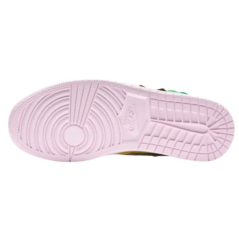These sneakers offer a vibrant, DIY-inspired makeover, featuring a colorful textile upper with rough cut edges, pastel pink on the exposed-foam tongue and rubber cupsole, and black accents on the collar, laces, and modified Wings logo. Removable Velcro patches on the heel allow for customization with a basketball, J Balvin’s iconic face, or a Jumpman branding.