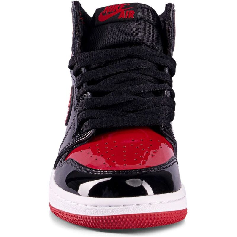 The Air Jordan 1 Retro High OG 'Patent Bred' elevates the legendary colorway with a lustrous twist. This version retains the quintessential design elements but introduces a sleek patent leather construction that captures the light with every step. The upper combines classic black paneling with bold Varsity Red accents on the toe box, Swoosh, heel overlay, and collar flap. A woven Nike tag graces the black nylon tongue, and the iconic Wings logo is prominently stamped on the lateral collar.