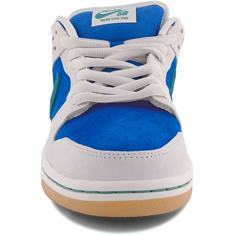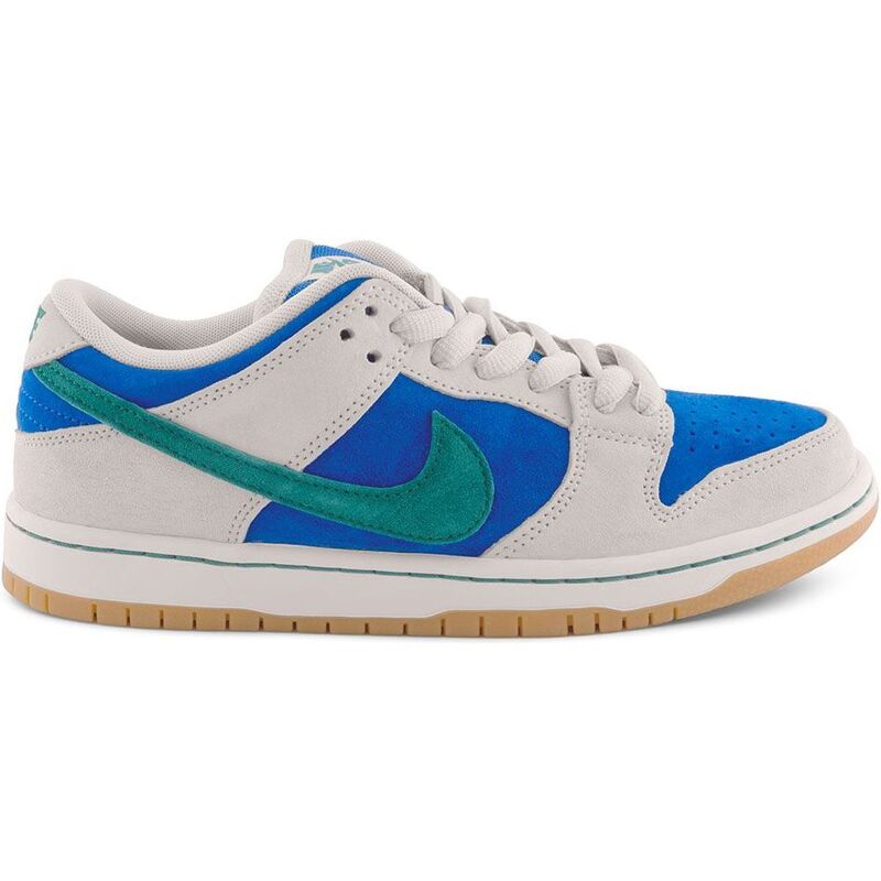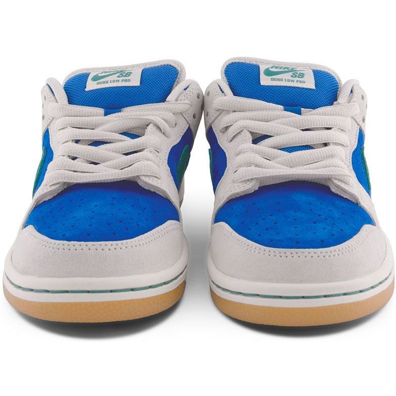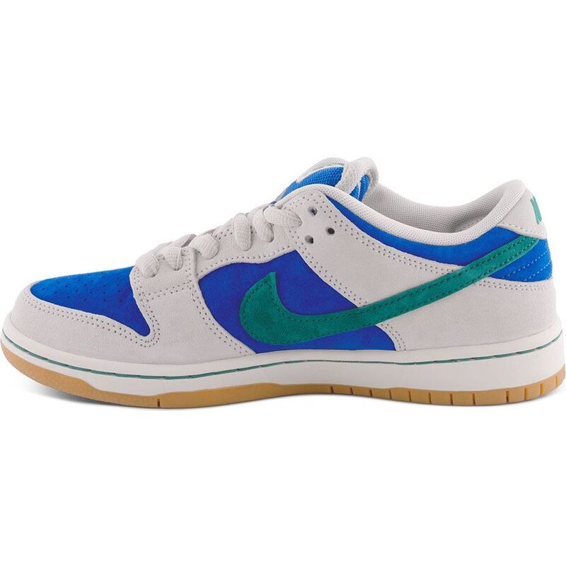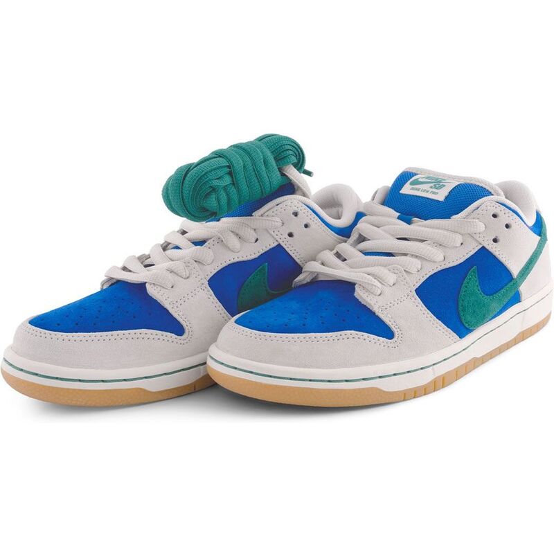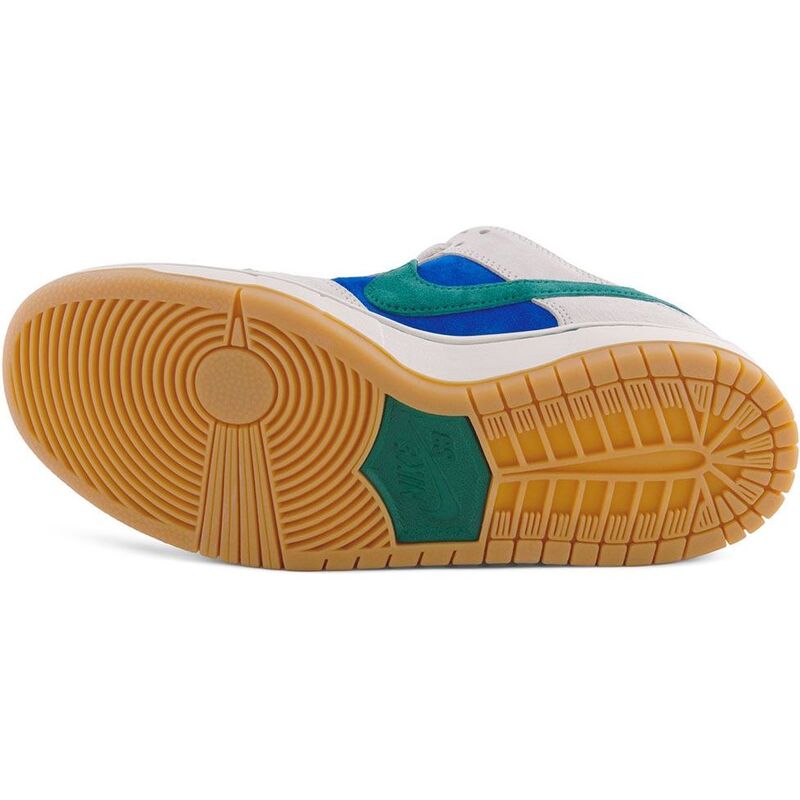 These sneakers feature a full suede upper in royal blue with off-white overlays and a grass-green Swoosh. The iconic Nike SB branding elegantly graces the woven tongue tag and sockliner, complemented by a Zoom Air unit in the heel for superior cushioning and a durable cupsole with white sidewalls and a grippy rubber outsole.