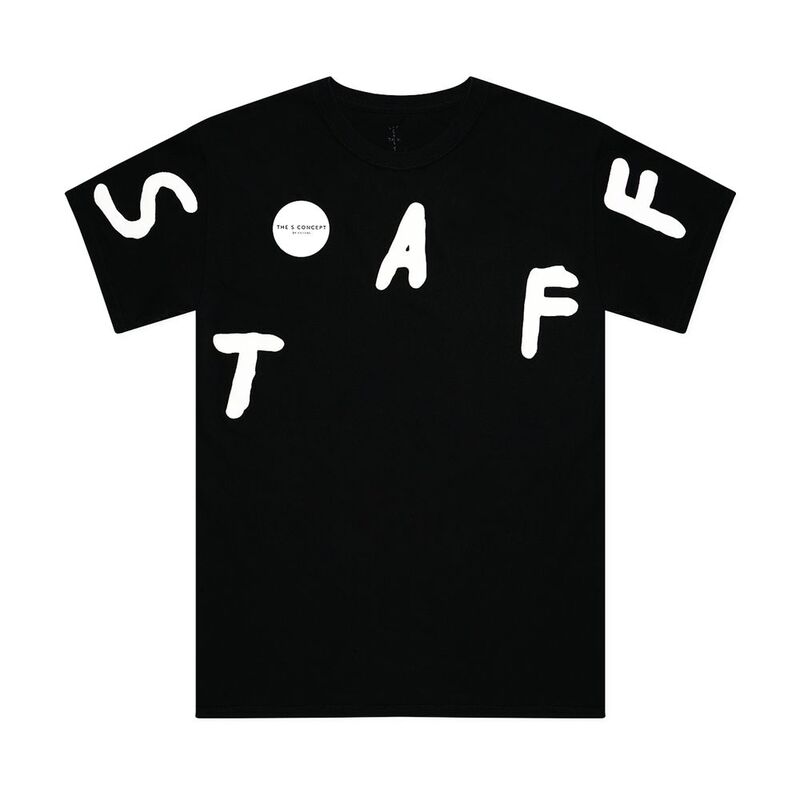 The Astrofest Staff 2019 Tee features an elegant black backdrop, showcasing the word "STAFF" in bold and playful white letters across the chest. The back of the tee honors the 2019 Astroworld Festival in a stylized white lettering, adding a touch of nostalgia and cultural significance.