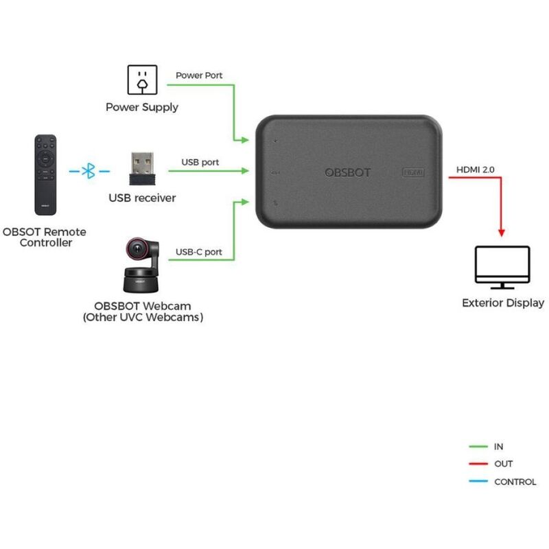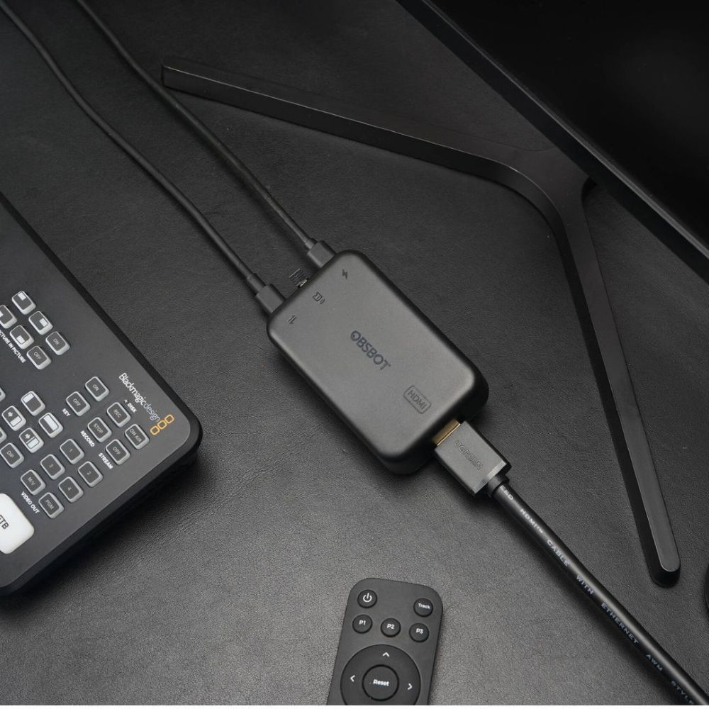 The OBSBOT UVC to HDMI Adapter allows you to monitor UVC output from your webcam or PTZ camera on any HDMI display with resolutions up to UHD 4K60. It features dual USB-C inputs for UVC source and power, a USB-A input for remote control, and an HDMI 2.0 output, offering plug-and-play convenience with low latency.