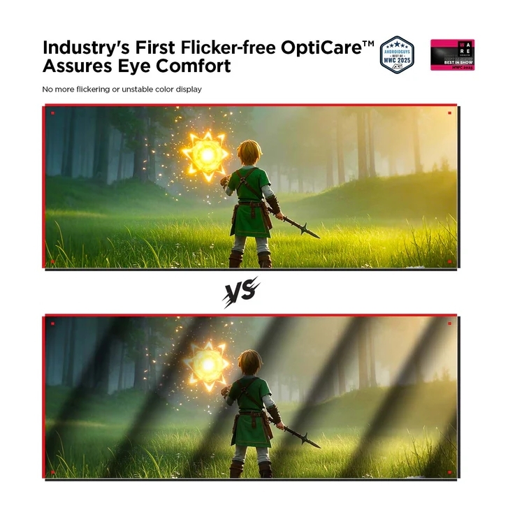 • Rest-Assured OptiCare™: OptiCare™ enhances eye comfort with 3840 Hz DC and PWM dimming, reducing flicker and color instability. The 20 brightness levels simulate natural light in dark environments. TÜV SÜD certification ensures low blue light and flicker-free comfort for long use.
