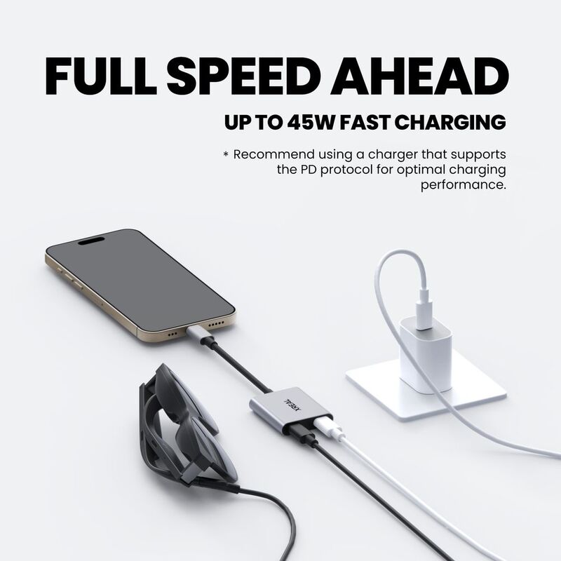 XREAL Hub, Power and Play Adapter, so you can charge AR glasses while you charge your source device, e.g. Steam Deck, ROG Ally, Switch, iPhone 15 or Android phone. 45 W fast charging