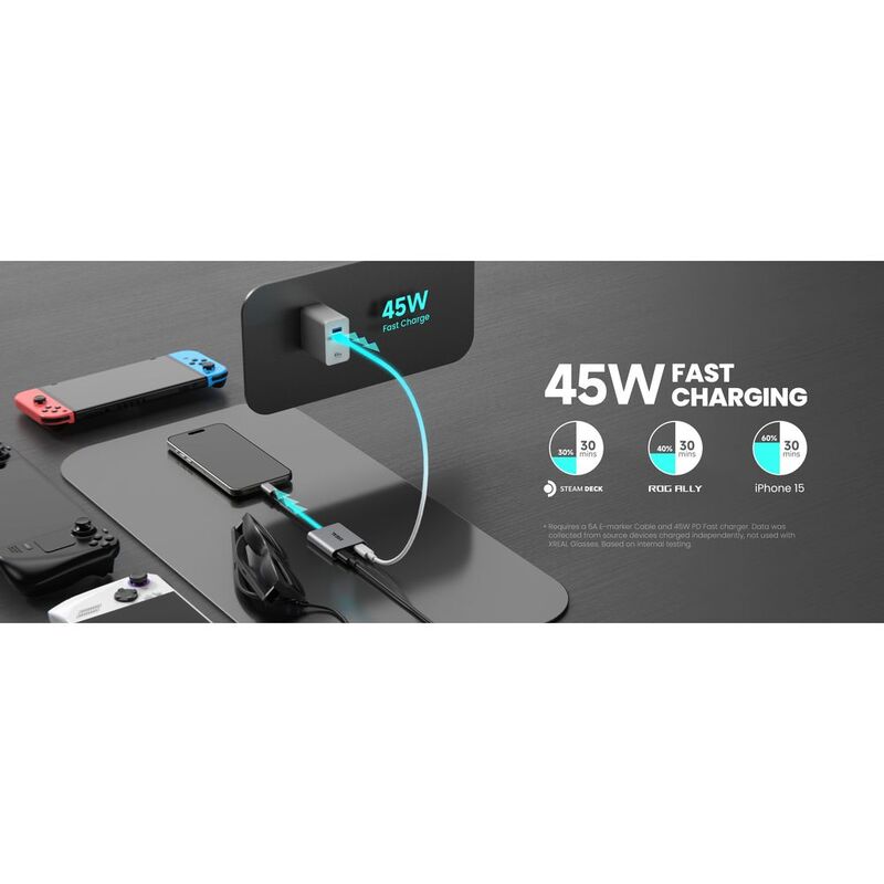Deliver up to 45W charging for your devices, all while using your XREAL AR glasses. Note: Charging capability depends on the source device.