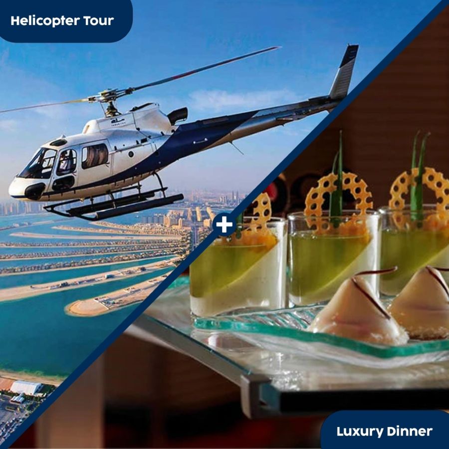 Celebrate your love with a romantic sunset helicopter tour followed by a luxury dinner buffet for two at Saffron, Atlantis. Enjoy breathtaking aerial views of Dubai's iconic landmarks as the sun sets, creating a magical backdrop. After your thrilling flight, indulge in a gourmet dining experience at Saffron, known for its exquisite cuisine and elegant ambiance. This unforgettable evening is perfect for anniversaries, proposals, or any special occasion.