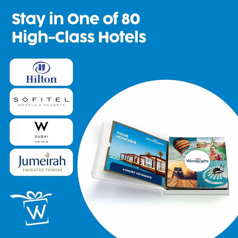• This gift box includes a high-class and luxury one-night stay with breakfast for two at your chosen premier hotel among 80 exquisite options across the UAE