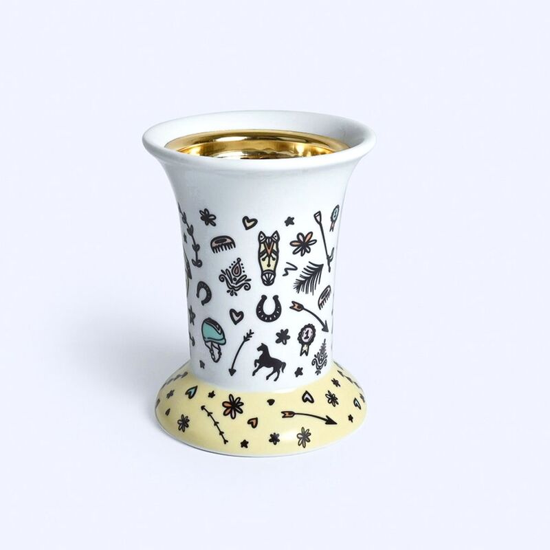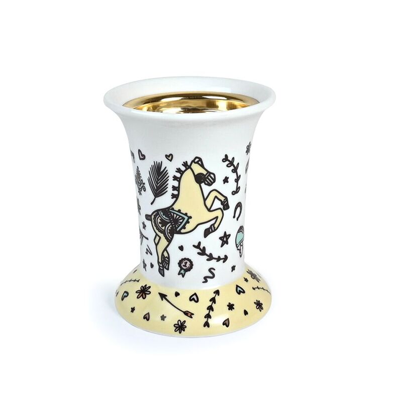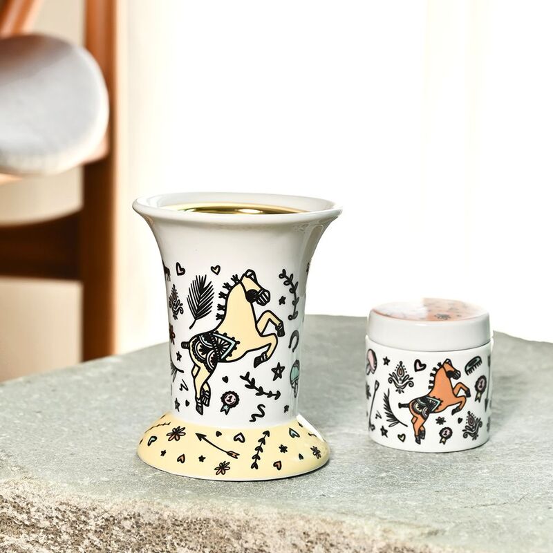 Sculpted from porcelain, this incense burner is adorned with a playful equestrian-inspired motif featuring horses, rosettes, boots and horseshoes in a quirky sorbet-hued palette. Once lit, plumes of bakhoor rise from the burner's opening, creating a captivating dance. When not in use, the burner is striking enough to double as a unique objet d'art.