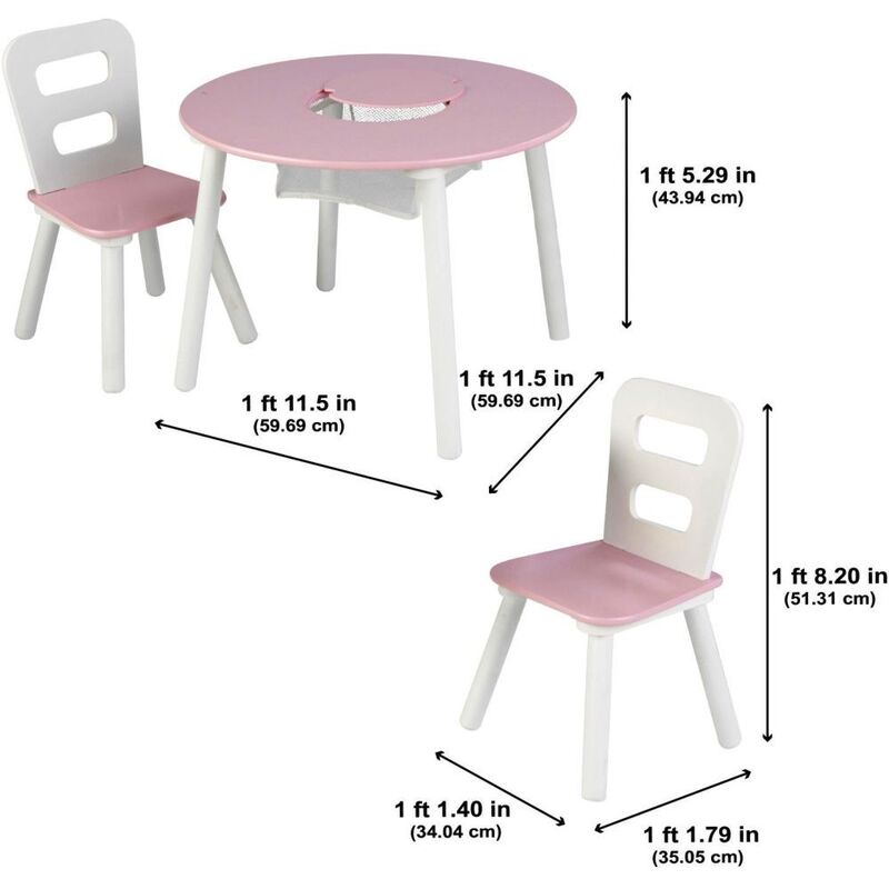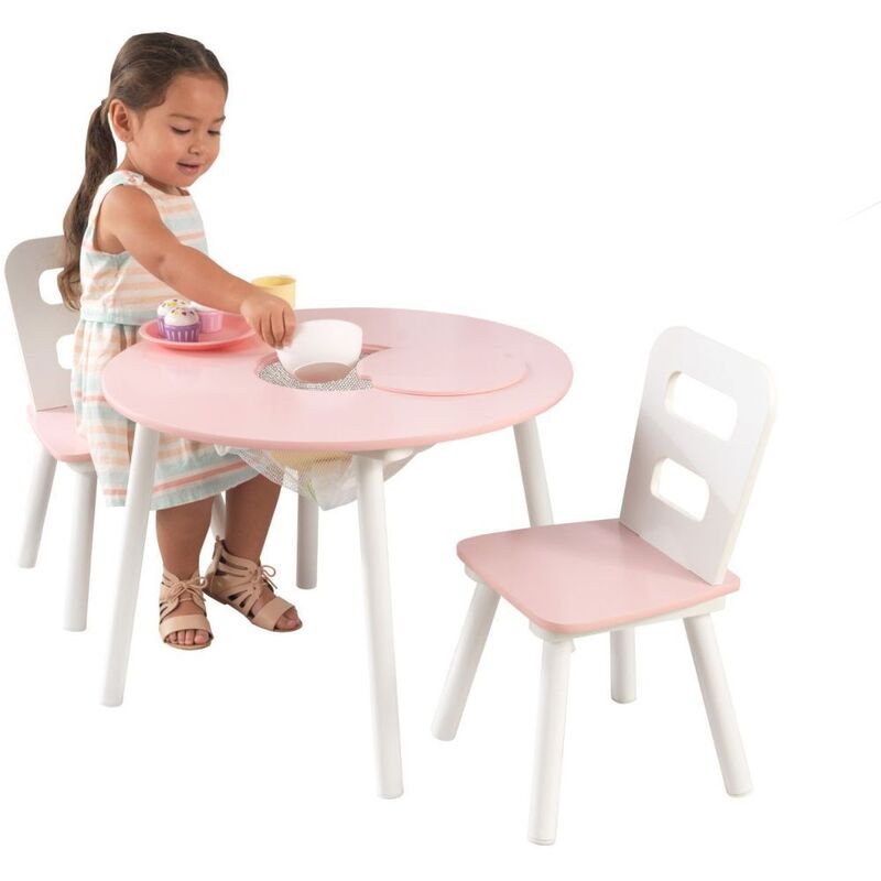 Whether coloring, crafting, doing homework or enjoying a snack, kids will love the KidKraft Round Storage Table and Chair Set. The two chairs are just their size and built from durable wood. The splayed legs are designed for stability - less chance to tip over. When playtime is done, kids can simply lift the table’s center panel, push their craft items and toys into the mesh storage compartment and the table is clean. The notches make it easy for little hands to open on their own, creating that independence they crave. Little ones love to have a spot of their own, and parents love the understated simplicity of this design that looks good in a playroom, living room or bedroom.