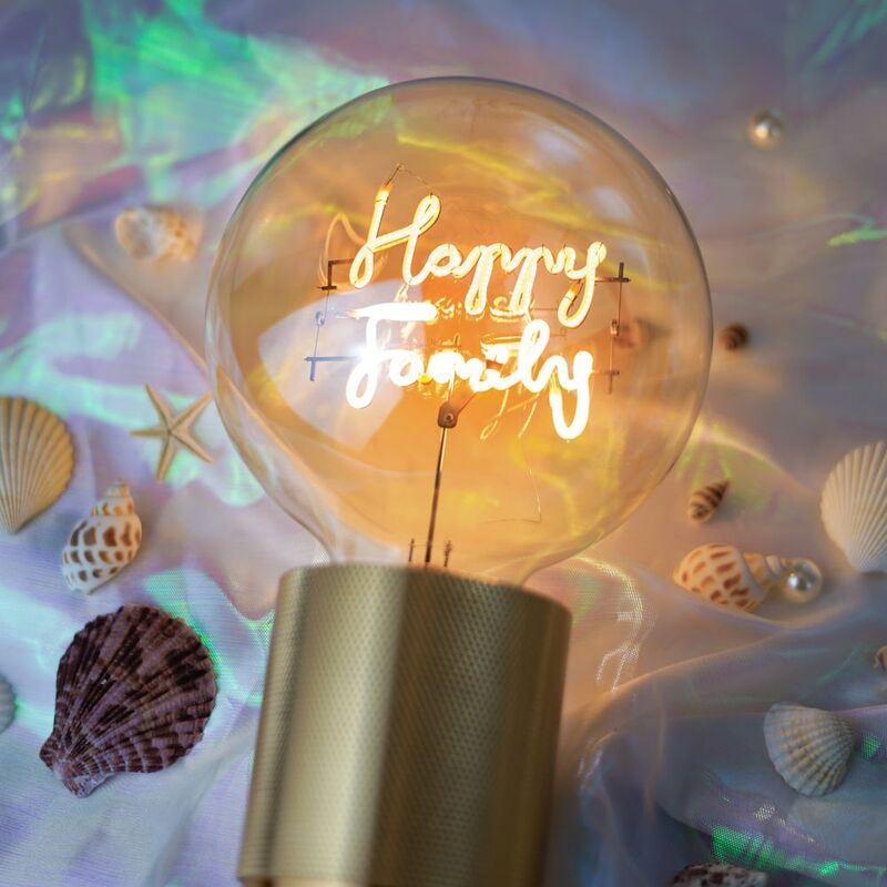 Illuminate your space with this Happy Family - Amber Glass - 2200K Light 9 Volt LED light bulb from Message in the Bulb. This innovative light bulb blends traditional lighting with contemporary design, featuring a captivating message that adds a personalized touch to any setting. Perfect for creating a warm, ambient atmosphere, this LED bulb is both energy-efficient and stylish.