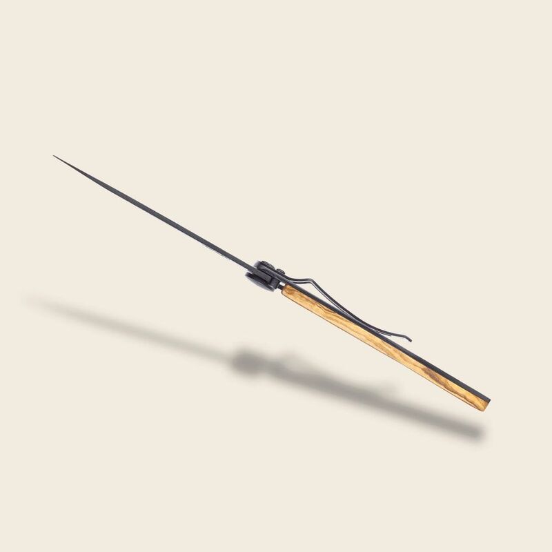 Ultra-light knife in Z40C13 stainless steel, grey titanium coating. Blade with secure liner lock system decorated with fine laser engraving. Belt clip. Olive wood handle. Scratch resistant.