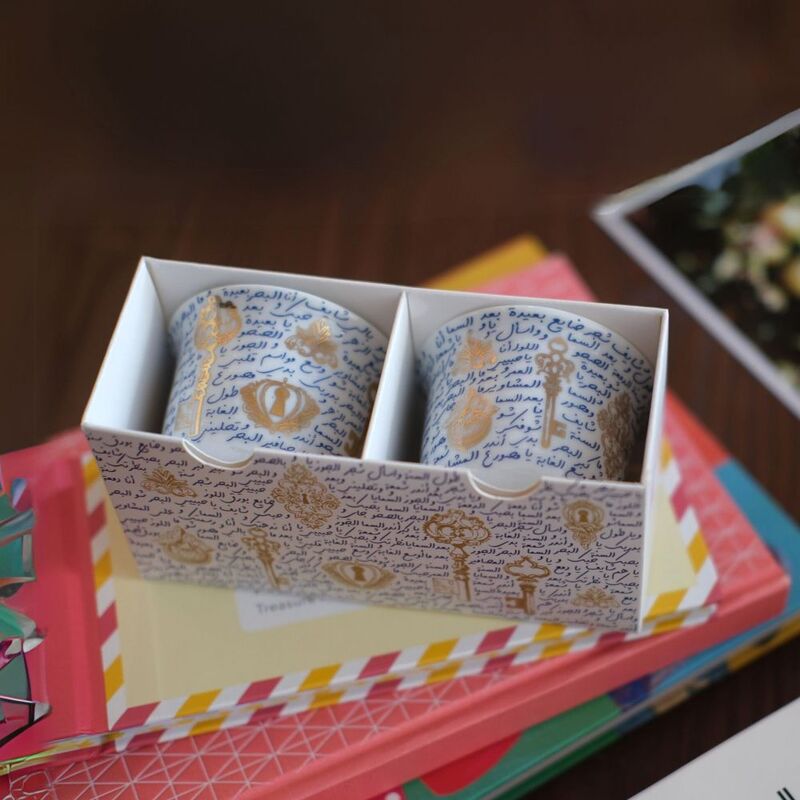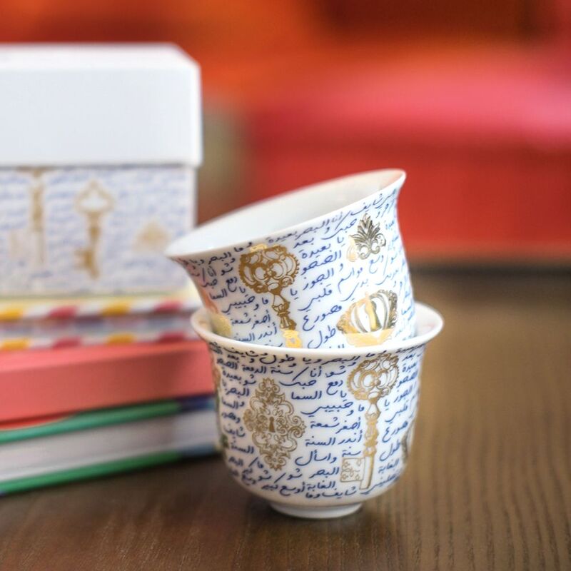 Embrace the artful charm of the Nagham Arabic Coffee Cup Set a duo of elegance and melody. Featuring intricate key motifs in 22K Gold and lyrics inspired by a heartwarming Arabic song, this set transforms your coffee moments into a harmonious celebration. Crafted from porcelain, it's not just a cup; it's a poetic fusion of design and Arabic songs. With its timeless appeal, it's a thoughtful gift for your dearest, expressing your love on any occasion.