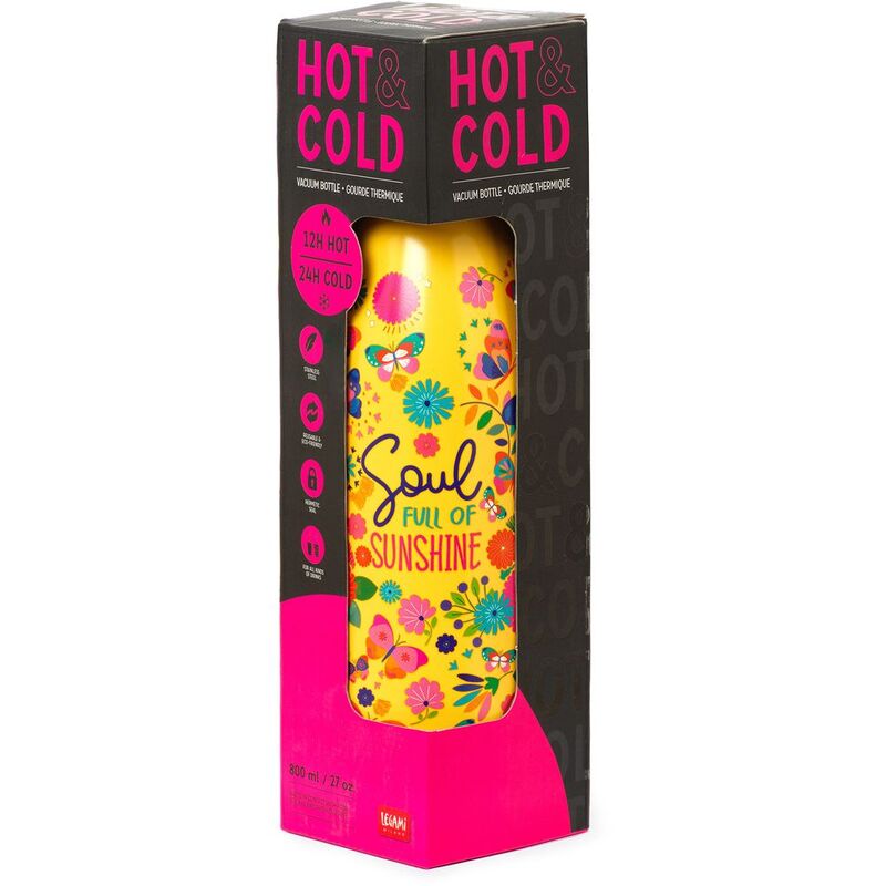 Say goodbye to plastic bottles and take-away cups with the Legami Hot&Cold 800ml Vacuum Bottle - Butterfly. Made of lightweight and resistant double-layer stainless steel, a hermetic seal and a removable silicone handle, this stylish and reusable bottle has a capacity of 800ml, keeping hot drinks warm for 12 hours and cold drinks chilled for 24 hours.