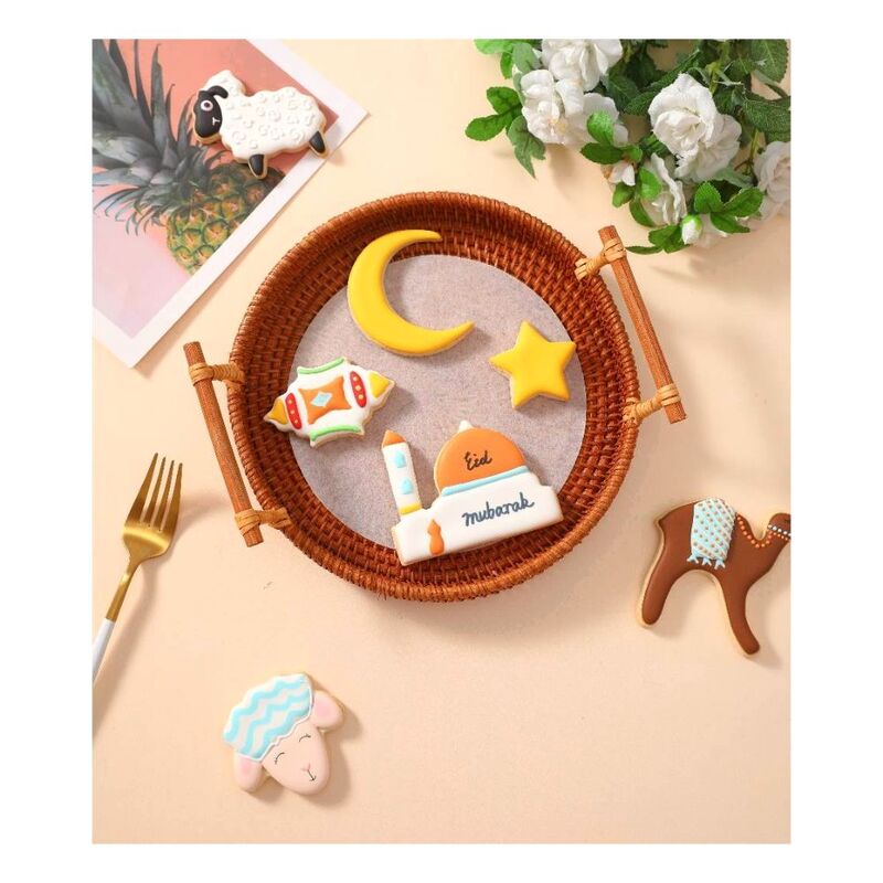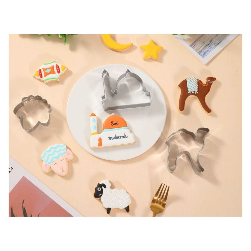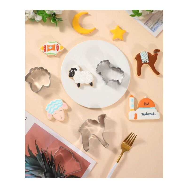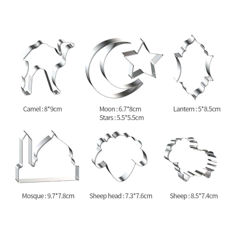 Celebrate Ramadan and Eid with some creative baking with your family and friends using these fun cookie cutter shapes. Hit the kitchen with this set containing 6 stainless steel cutters shaped as: a crescent moon, a lantern, a sheep, a sheep's head, a mosque and a camel. Use cookie dough, fondant, biscuits, brownies, cake and even craft clay! Cookie cutter dimensions differ according to design: