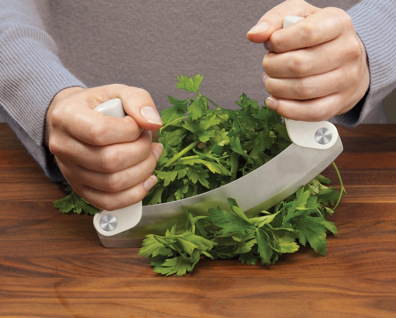 Taking its name from the Italian word for 'half moon', this traditional utensil for chopping herbs is updated with a design that is both safer and more compact than the original.