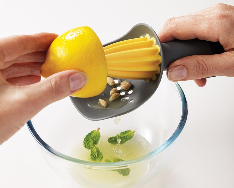 The clever rubber cup catches all the pips and pulp and strains them so the juice can drain through, letting you squeeze your citrus fruits over your cooking/baking and add directly into your meals.