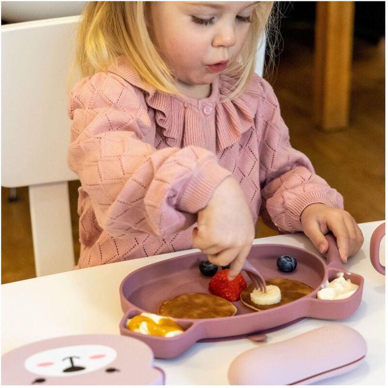 • Fork has a bowl-shaped nylon head for easy stabbing and scooping. Spoon has a soft and narrow silicone head for easy scooping and dipping. Small bumps on the rear stop it from rolling on the table