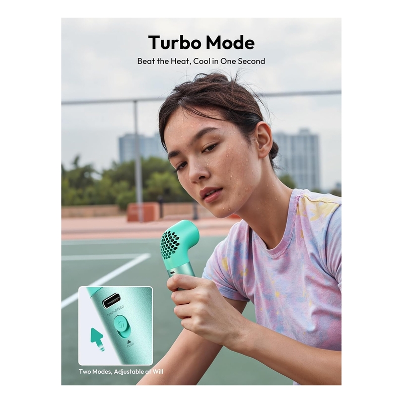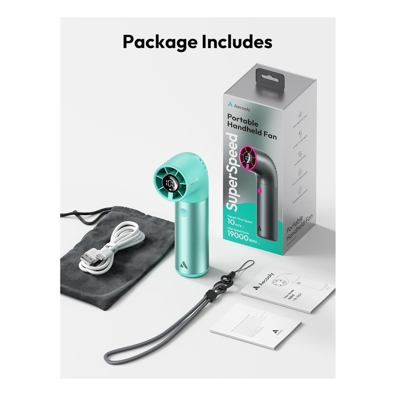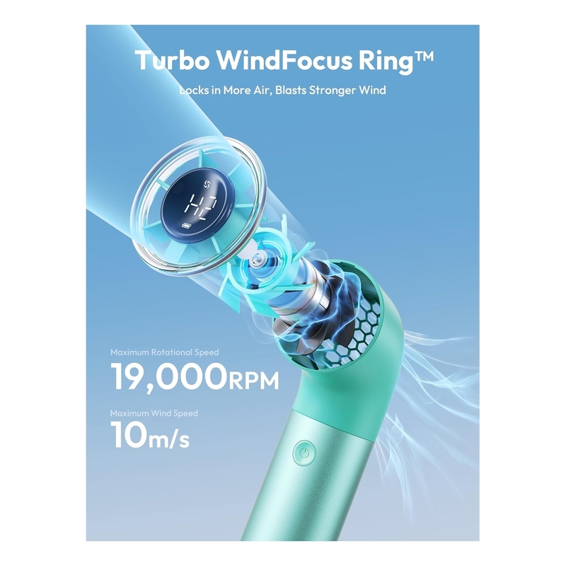• Aecooly Mini Portable Fan powered by a robust Turbine Brushless Motor offers exceptional cooling performance with a maximum rotation speed of 19,000 RPM and wind speeds up to 11 m/s. It rapidly circulates powerful airflow, providing quick and efficient cooling, whether you're facing intense summer heat or seeking relief after exercise. The strong, invigorating breeze cools down your environment instantly, offering refreshing comfort that cuts through the heat.