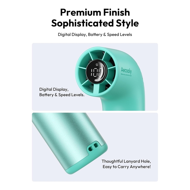Stay cool anywhere with the Aecooly Mini Aero Ultra, designed with a compact R-shaped grip for ergonomic comfort and portability. Powered by a 19,000 RPM brushless motor, it delivers turbo airflow up to 11 m/s for instant relief. With 7 adjustable speeds across dual modes (P-Mode and H-Mode), you can customize your cooling experience with ease. The sleek aluminum casing ensures durability and style, while the smart LED display lets you monitor speed and battery at a glance. Perfect for outdoor adventures, workouts, or everyday use.
