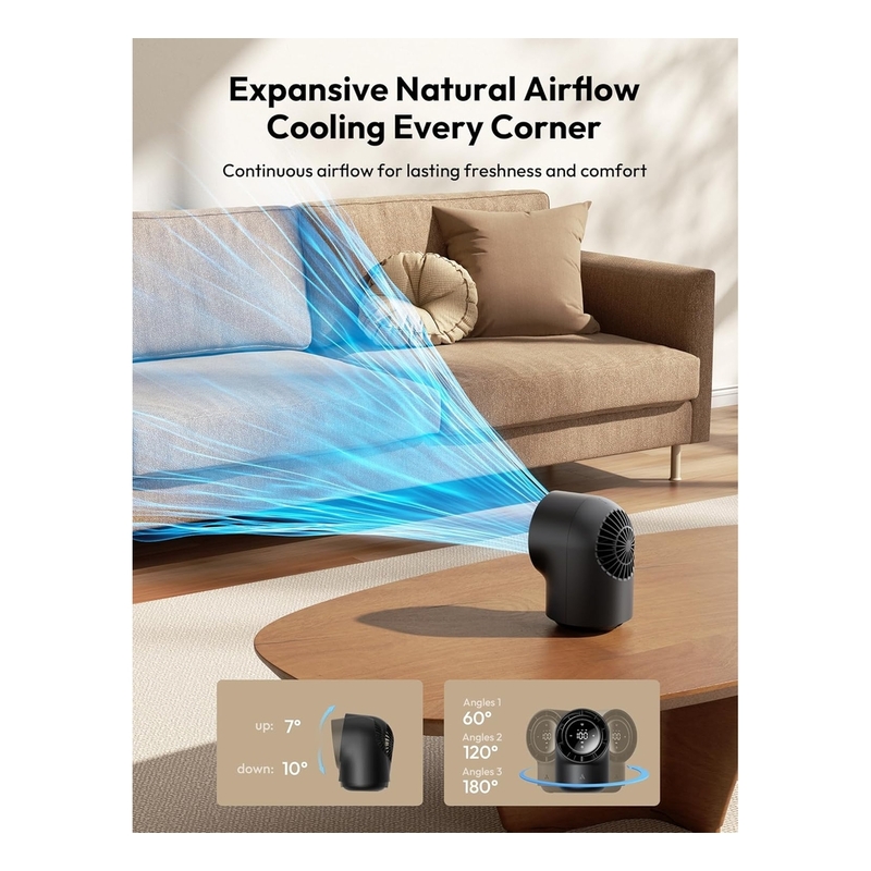 • Enjoy customized airflow with 3 oscillation angles—60°, 120°, and 180°—ideal for personal use, or shared spaces. The fan head also tilts up 7° and down 10° to direct cool air exactly where you need it.