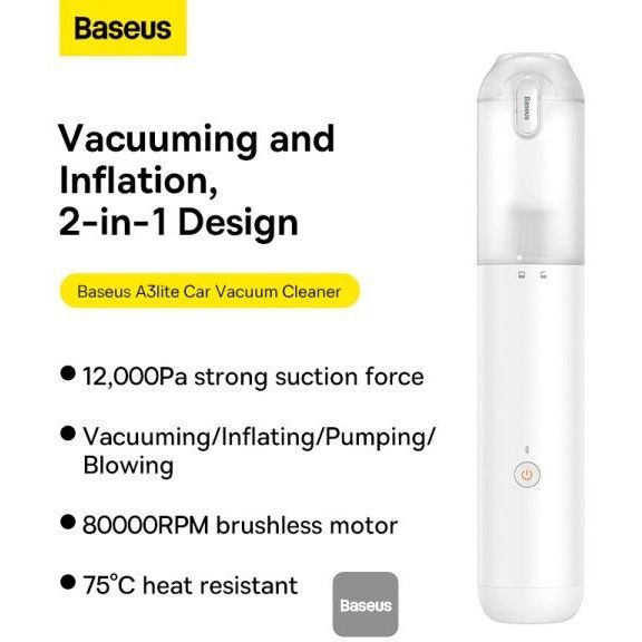Experience how simple car cleaning can be. The Baseus A3 Lite cordless car vacuum cleaner stands out with a suction power that reaches up to 12,000 Pa and a motor speed of 80,000 RPM. The durable battery provides up to 30 minutes of operation, and the HEPA filter effectively removes even the finest dust particles. In the set you will find up to 4 additional tips, with the help of which you can inflate a mattress, a swimming wheel or suck air out of a vacuum clothes bag.