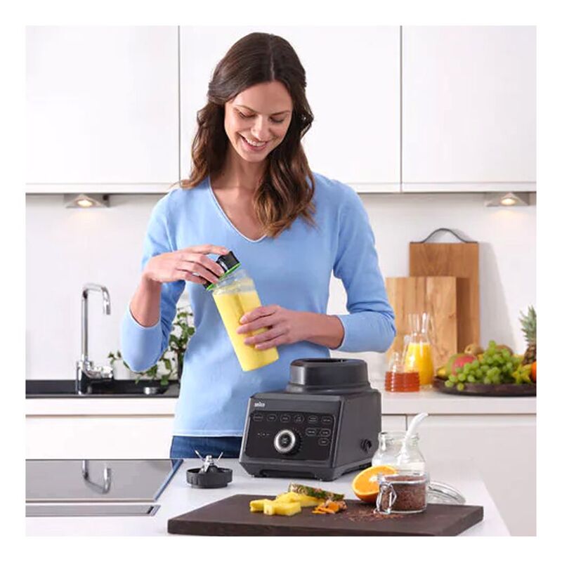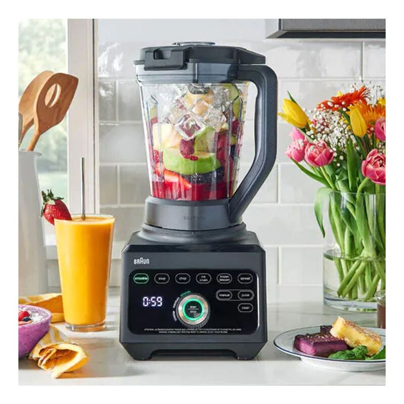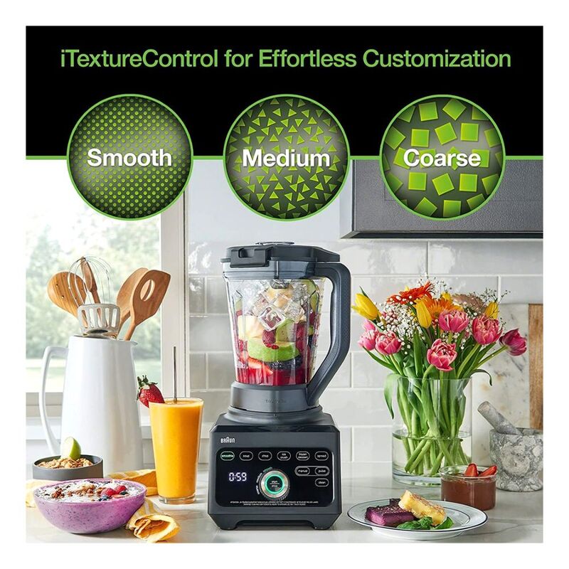 Braun’s PowerBlend 9 is a powerhouse kitchen performer with a sophisticated range of new technologies. Its iTextureControl lets you customize your blends from very smooth to coarse – and 18 food programs automate your texture adjustment in three effortless steps. The TriAction Technology jug delivers 60 % finer and 4x faster blending. And you’ll enjoy 1600 watts of power and up to 45,000 rpms for high quality blending results with a German- made PrecisionEdge blade that effortlessly emulsifies even the toughest ingredients.