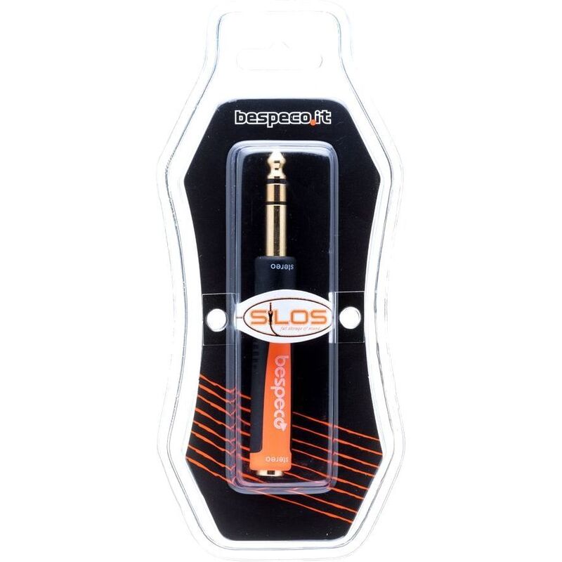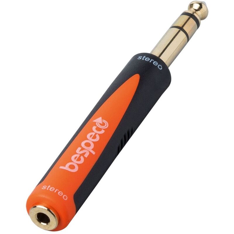 Styled in black and orange, the Bespeco 1/4" Stereo Male to 3.5mm Stereo Female Jack Adapter provides connections between disparately outfitted terminations—connections which don't usually agree. In this case, the adapter bridges the gap between a 1/4" stereo male and a 3.5mm stereo female jack, allowing you to connect devices which, heretofore, could not be conjoined.