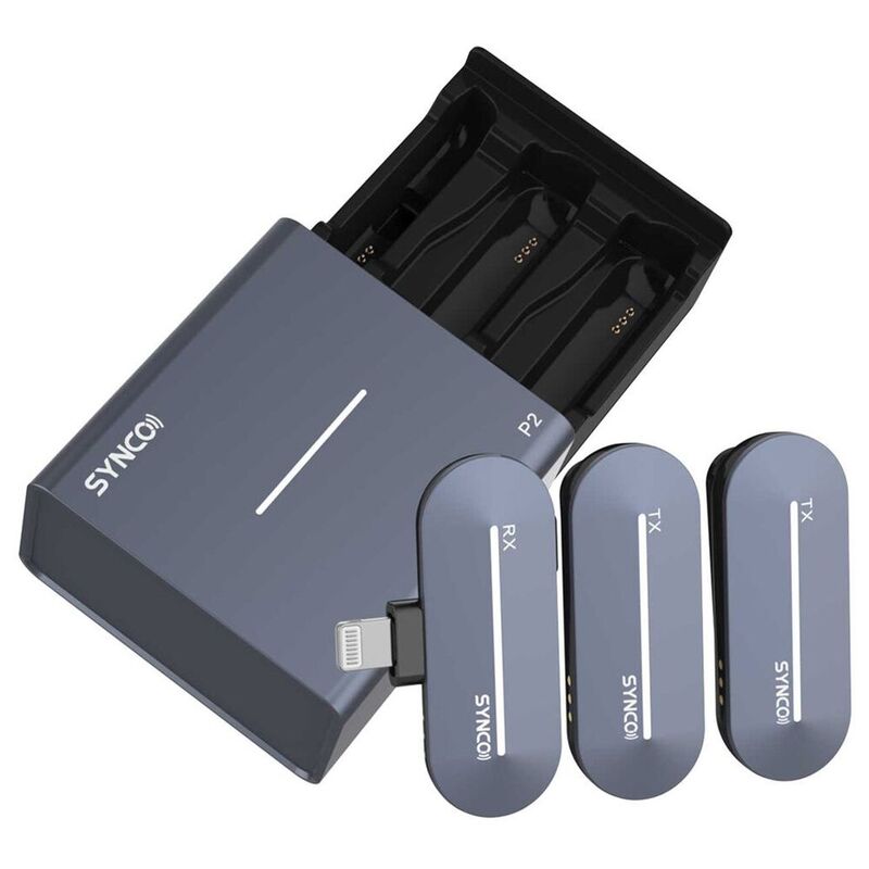 The stone blue Synco P2L is a miniature, digital wireless microphone system offering an easy-to-use, cost-effective, and all-inclusive solution for recording two on-camera personalities to an iPhone or iPad equipped with a Lightning port. It delivers considerably improved sound quality compared to the built-in mics on your iPhone, supplying clear, intelligible speech for shooting videos on Instagram, YouTube, and TikTok or for live streaming and online meetings. The P2L includes two tiny, lightweight clip-on transmitters, each with its own built-in omnidirectional microphone, along with a compact dual-channel receiver featuring a Lightning connector that plugs directly into your iPhone. A 3.5mm jack on the receiver lets you plug in headphones for monitoring while you're recording. The requisite USB charging cable for the transmitters is included as well as a charging case with a built-in battery that allows you to store and recharge your components. The system uses a Syncoder Encrypted Transmission Algorithm (FHSS) transmission scheme to ensure reliable operation with clear sound at a line-of-sight distance up to 492'. The transmitters' built-in rechargeable batteries provide up to 5 hours of operation and recharge via the USB Type-C ports. The dual-channel receiver is powered by your iPhone and needs no battery to operate. When the receiver is plugged into your phone, the receiver's USB Type-C port allows you to recharge your phone while in use, allowing you to record for numerous hours on a USB power pack or indefinitely, if you have access to AC.