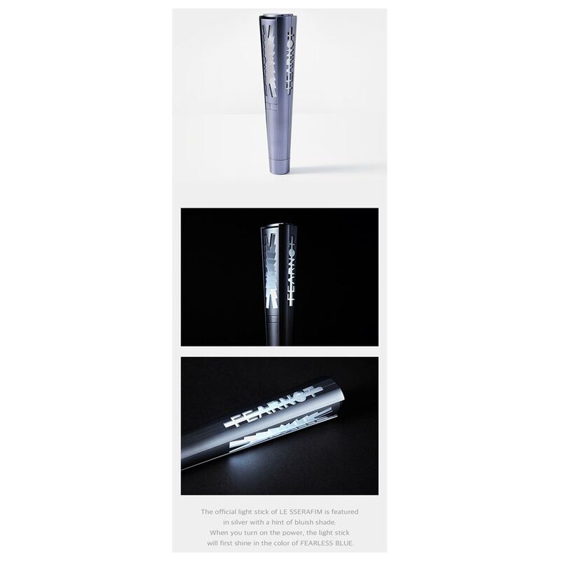 From the front, the light stick features the LE SSERAFIM symbol piercing through, while the side emits light through the FEARNOT logo. Crafted in sleek silver with a hint of blue, the light stick bursts into life in FEARLESS BLUE when powered on.