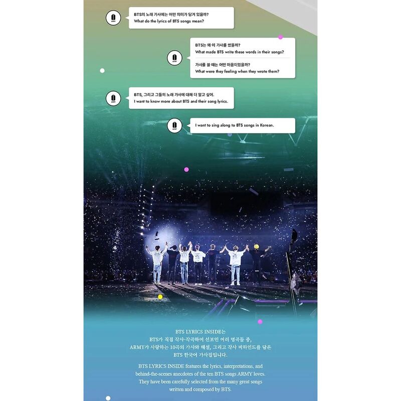 BTS LYRICS INSIDE will give the BTS ARMY a behind-the-scenes insight into the members' songwriting process behind their biggest hits. At the same time, the book provides a deeper understanding of the lyrics. A great crash course in Korean by the help of all your favorite songs from BTS.