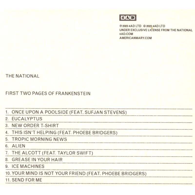 First Two Pages of Frankenstein is The National's ninth studio album. This 11-song collection signals a new chapter in the band's discography. Anchored by evocative melodies and an enthralling lyrical narrative, First Two Pages of Frankenstein finds The National sounding more creatively energized than ever and poised to earn them even more fans. The album was produced by the band at Long Pond Studios in upstate New York and features guest appearances by Taylor Swift ("The Alcott"), Phoebe Bridgers ("This Isn't Helping" and "Your Mind Is Not Your Friend") and Sufjan Stevens ("Once Upon a Poolside"). Formed in New York in 1999, The National consists of Matt Berninger (vocals) fronting two pairs of brothers: Aaron (guitar, bass, piano) and Bryce Dessner (guitar, piano, orchestration), and Scott (bass, guitar) and Bryan Devendorf (drums). The group has scored five top 10 albums on The Billboard 200, with 2017's Sleep Well Beast earning the Grammy for Best Alternative Album.