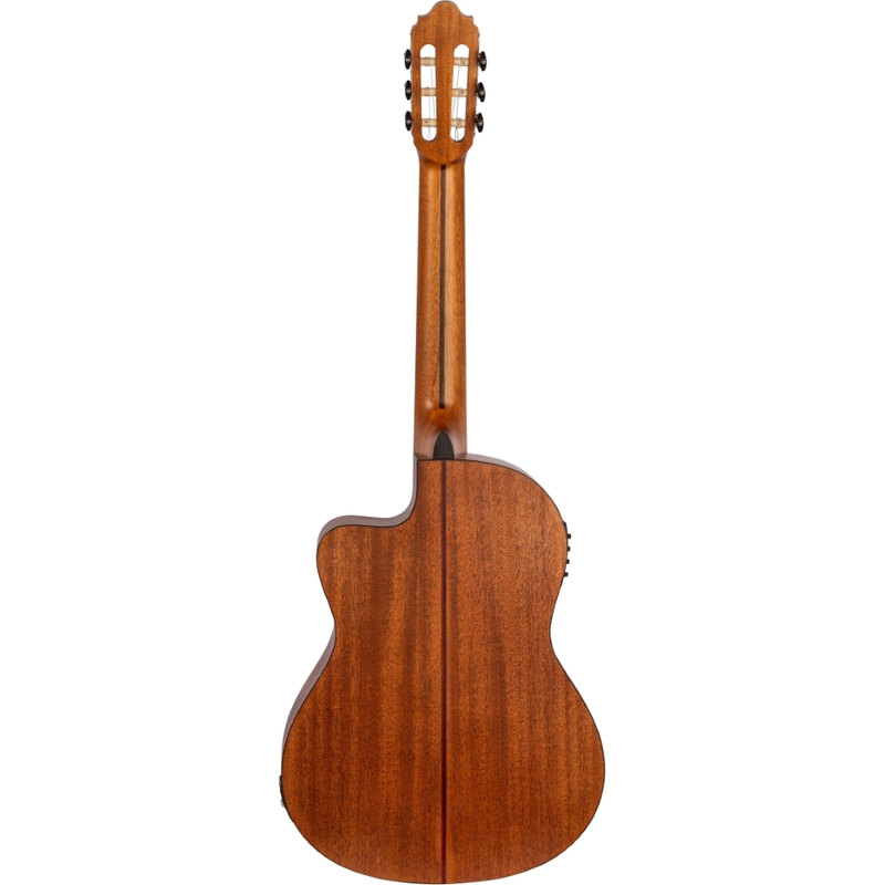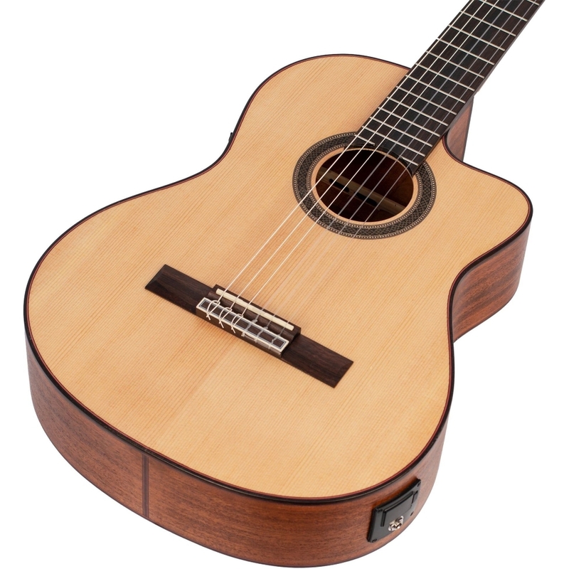 The Solid Sitka Spruce Top, with innovative ToneFlow bracing, gives this guitar an outstanding range that responds to your lightest touch with articulation and detail. Premium Mahogany back and sides enhance low-mid richness. A premium Mahogany neck and Amara Ebony fingerboard deliver exquisite playability. Other features such as exotic wood veneers, inlaid natural wood mosaic rosette and custom decorated machine heads result in a classical guitar that exceeds expectations in looks, tone and feel.