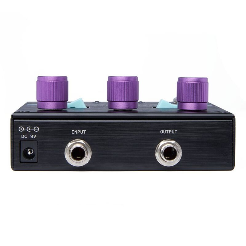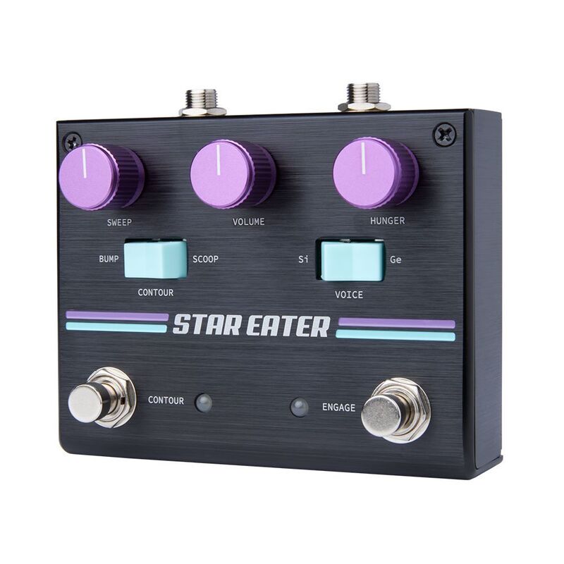 Star Eater is an all-analog, dual footswitch super-jumbo Fuzz with a footswitchable booster and variable filter stage, allowing players to easily sculpt a massive array of inspiring, unique fuzz tones. On the fuzz side, newly-available, precision-matched transistor pairs are utilized to ensure that each and every unit is perfectly dialed in to “the sweet spot” that can be so elusive to find in vintage pedals. A rocker switch provides your choice of Germanium or Silicon color. Downstream from the fuzz, a powerful booster stage drives the filter in the Star Eater. Scoop and Bump voicings for the filter can be selected via a rocker switch, drastically changing the frequency response of the Sweep control throughout its entire range. Built to last and designed to inspire, the Star Eater brings a unique approach and a new standard of performance to the world of boutique fuzz pedals. Runs on standard 9VDC.