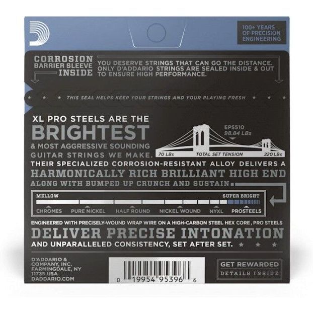 XL ProSteels are D’Addario’s brightest electric guitar strings. The unique, highly magnetic alloy in ProSteels offers a super bright, crunchy tone, and increased sustain. Made with a high carbon steel core and stainless steel wrap wire, ProSteels produce enhanced interaction with magnetic pickups, creating an extraordinarily bright tone that will cut through any mix. 10-46 Regular Light strings are our most popular gauge, providing a nice balance of tone and playability.