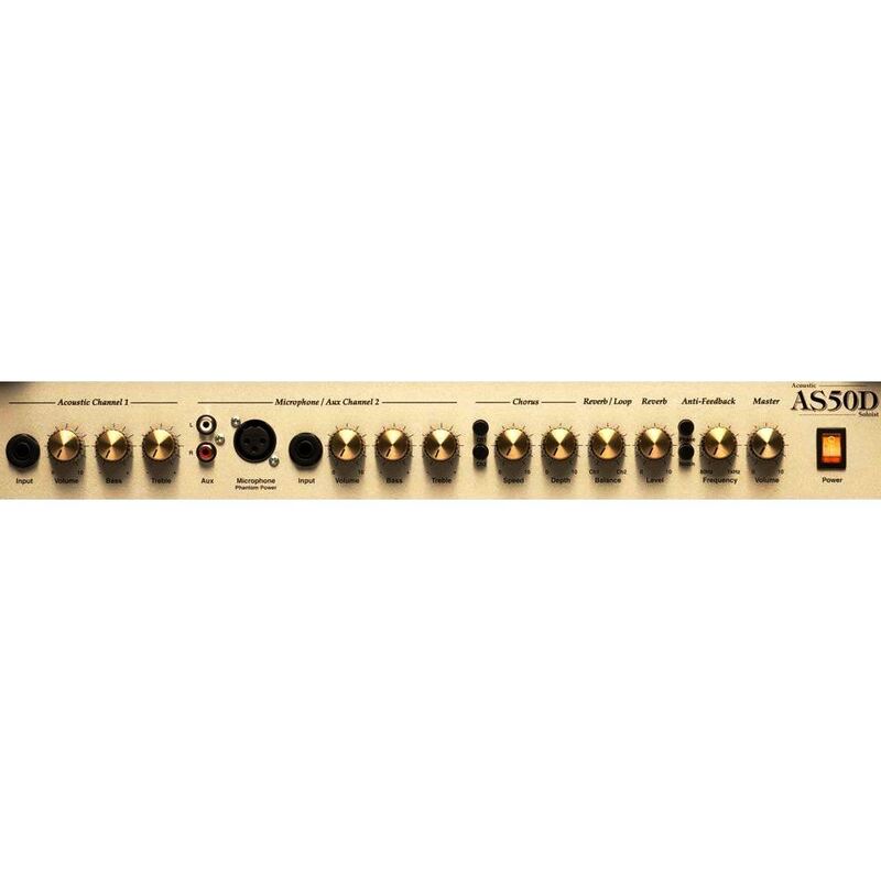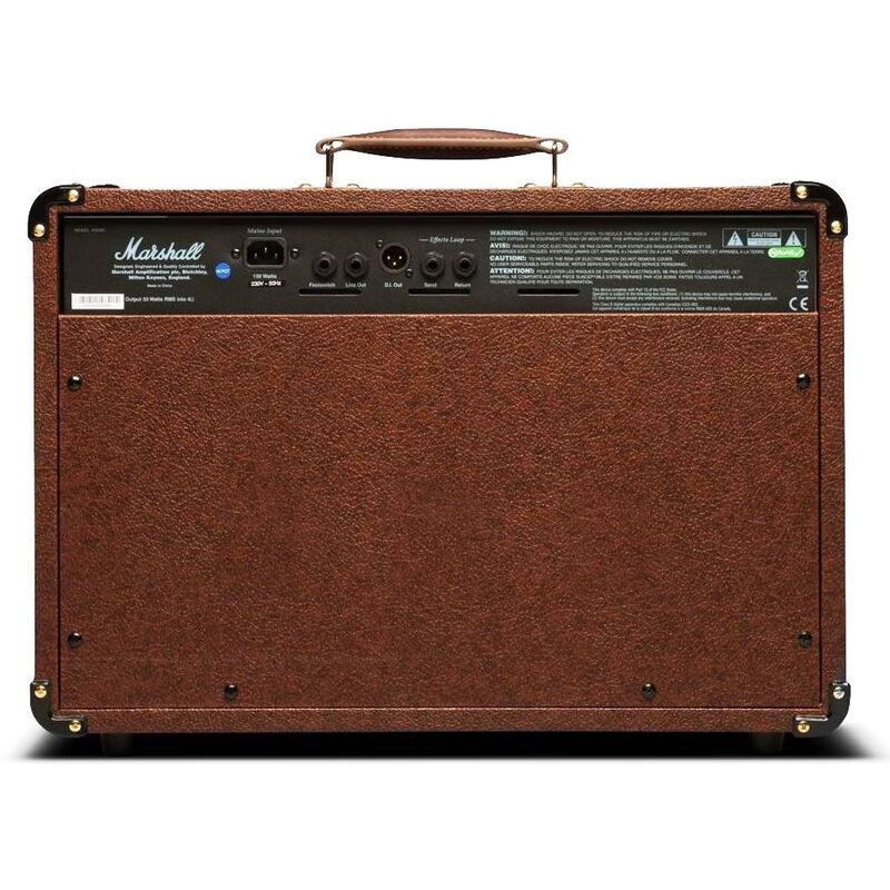 Amplify your next acoustic gig with the Marshall AS50D acoustic amplifier combo. This compact and robust acoustic amp is perfect for small and mid-size gigs. The dual-channel layout lets you plug in your guitar and a vocal mic for a complete PA. Built-in chorus and reverb are perfect for adding subtle depth and breath to your acoustic sound. A dedicated line out and DI lets you feed your signal to the house mixer when playing larger stages. Let Marshall power your next acoustic gig with the AS50D acoustic amplifier.