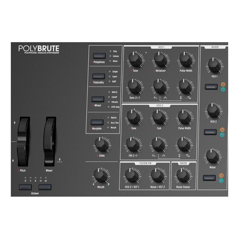Freely express your musical style and bring your creative ideas to life with PolyBrute's hands-on controls, flexible interface, and premium velocity-sensitive keybed with aftertouch. From the Morphée to the responsive ribbon controller, every aspect of PolyBrute ensures that your sound is an extension of yourself.