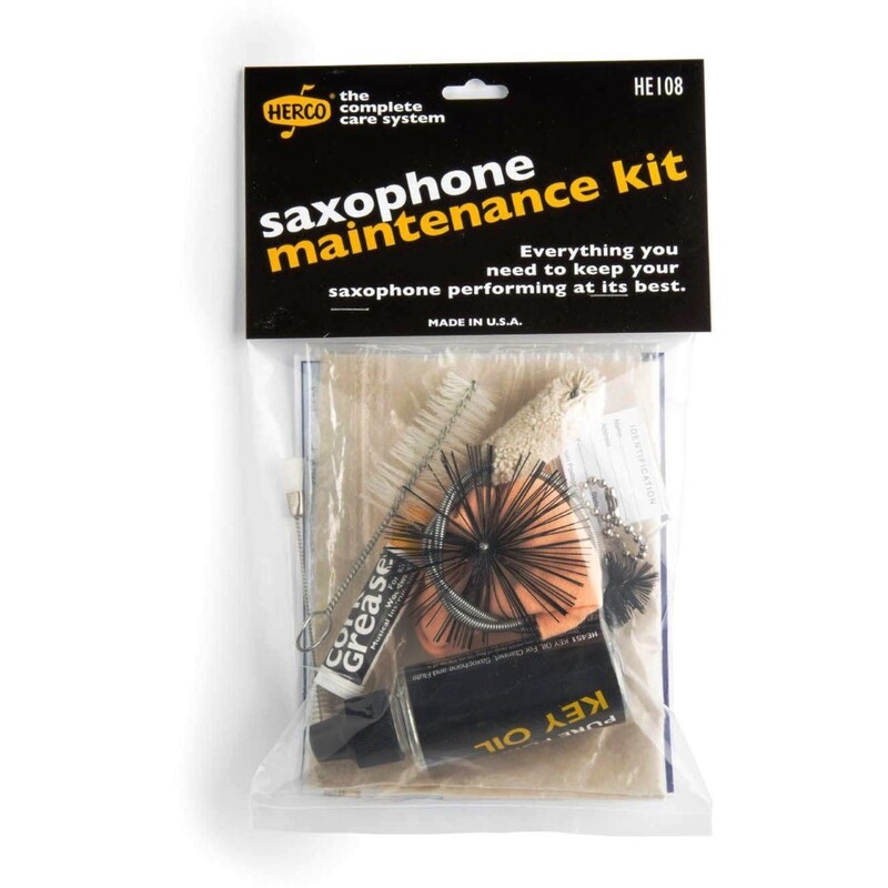 Contains: HE56 Saxophone Swab, HE57 Saxophone Neck Cleaner, HE96 Polish Cloth, HE85 Mouthpiece Brush, HE451 Pure Formula Key Oil, HE72 Cork Grease, HE825 Duster Brush, HERCO® I.D. Tag, HERCO® Complete Care Instructions